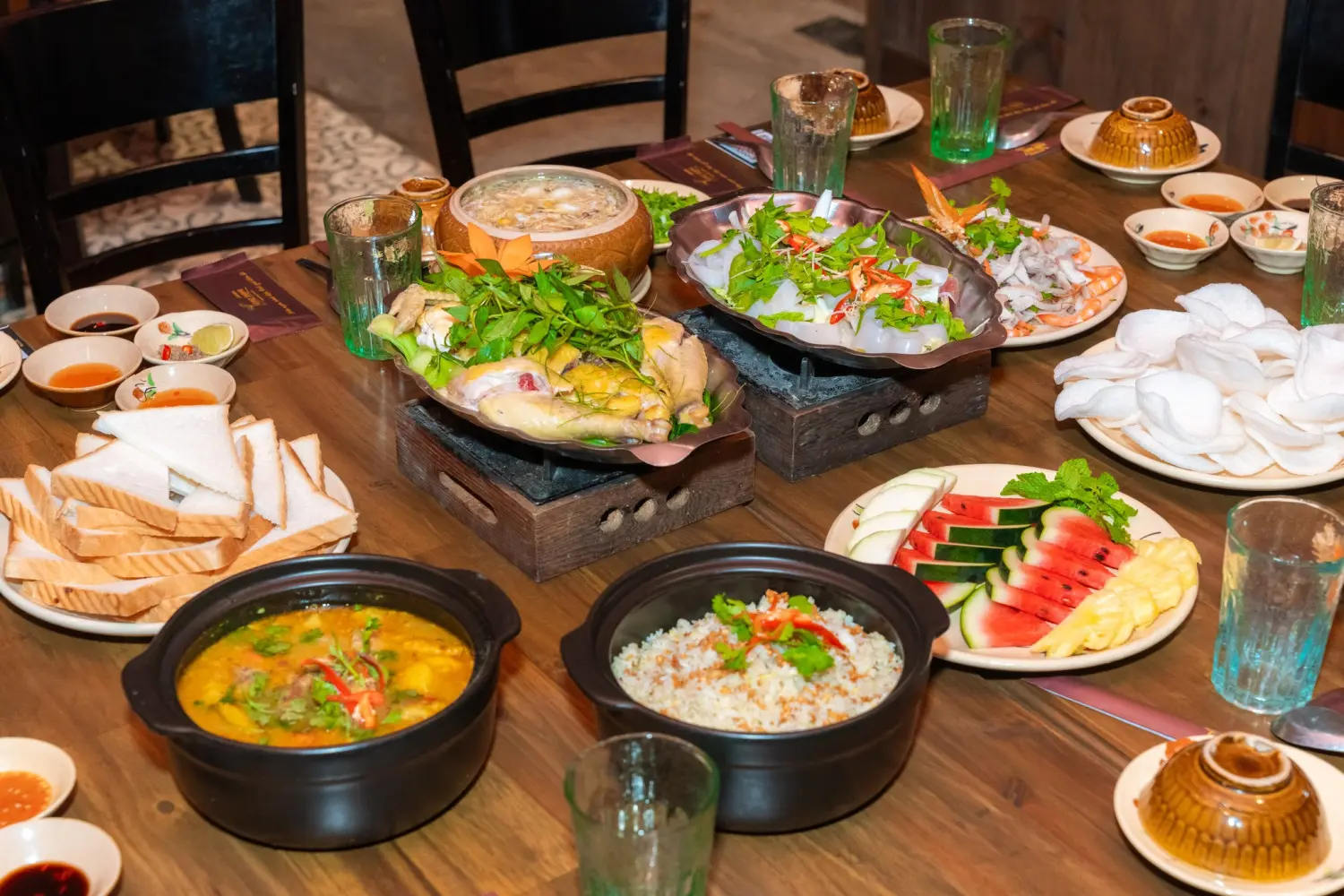 Cơm niêu, Cá kho tộ, Canh chua, Thịt luộc cà pháoTái hiện trọn vẹn mâm cơm gia đình Việt, cơm niêu cháy vàng giòn tan.