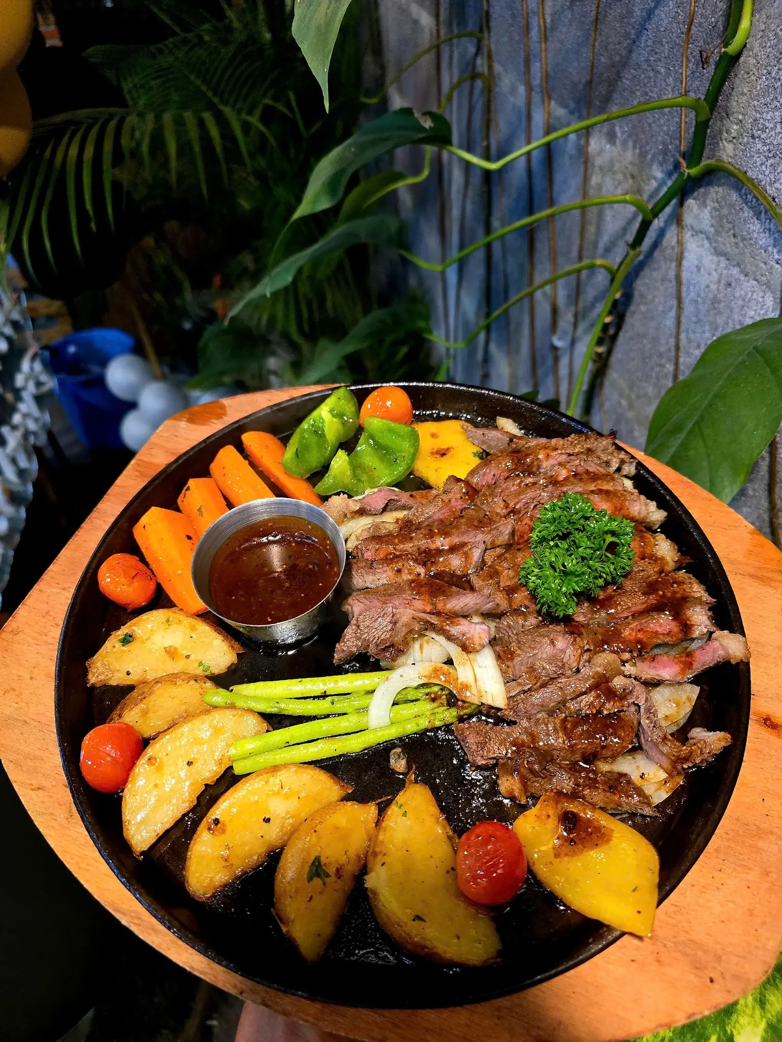 Фирменный гриль: Шипящая австралийская говядина, стейк под соусом из соленого желтка.